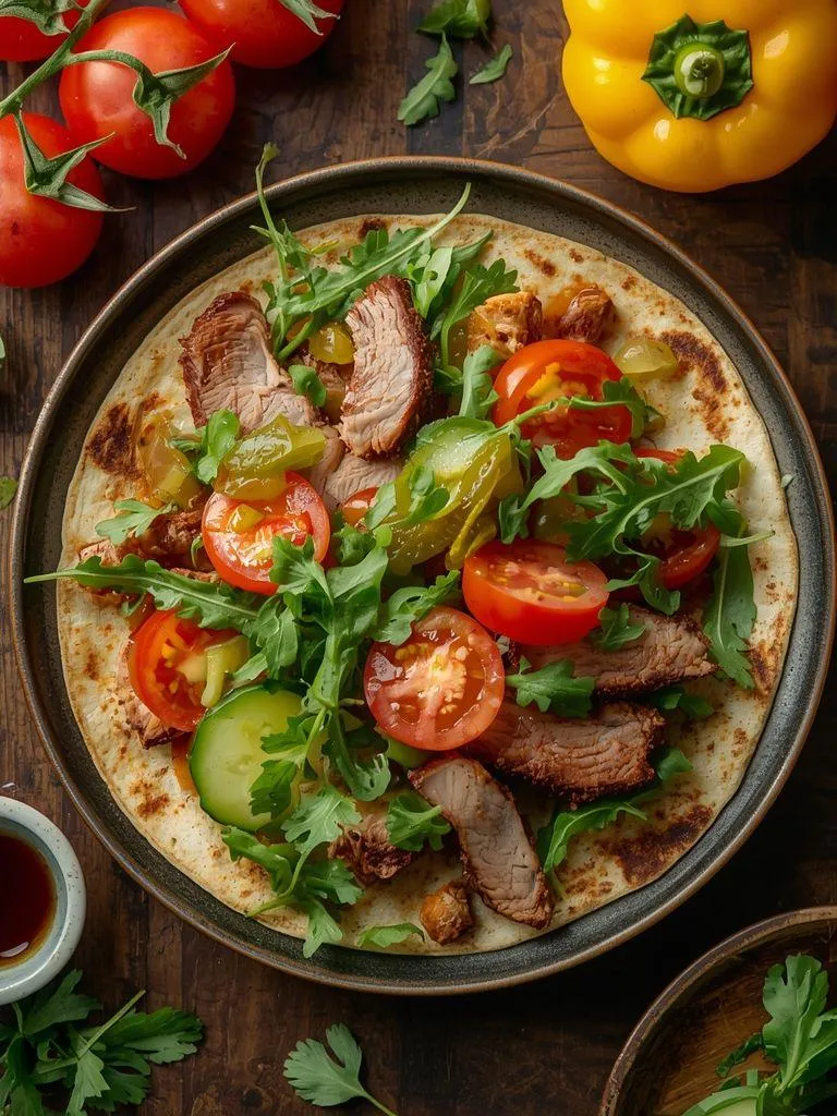 Tortilla z pieczonym schabem, rukolą, pomidorem, ogórkiem konserwowym i papryką na zimno