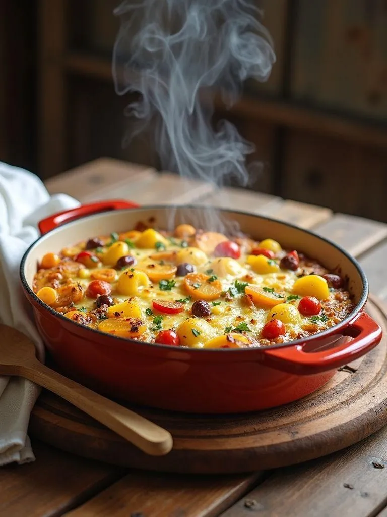 Wegetariańska zapiekanka ziemniaczano-warzywna z jajkiem i serem