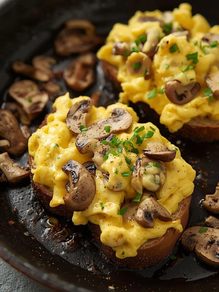 Nastaw patelnie aby się grzała. Pieczarki umyj, pokrój w paski, polej odrobinę oleju na patelnię i podsmaż pieczarki. Gdy woda już wyparowała, dodaj jajka i zmniejsz całkowicie ogien. Usmaż jajecznicę według własnych upodobań.
