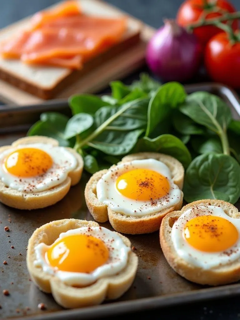 1. Przygotuj piekarnik do temperatury 180°C. 2. Odcinać górną część chleba i wyrąbywać jego środek. Pokroić szpinak, podsmażać go na patelni z niewielką ilością wody, dopóki nie zmieni się w miękką konsystencję. Chłodzić i wyciskać z niego nadmiar wody. Układać w środku chleba pokrojony łosoś i pozostałe składniki. 3. Wkładać jajko do chleba, posypywać ulubionymi przyprawami (np. sól, słodka papryka, pieprz). Rozmieszczać na blasze do pieczenia i piec przez 12–15 minut. 4. Myć i kroić pomidora w kostkę, pokroić cebulę. Mieszać i doprawiać do smaku. 5. Podawać pieczone chleby z sałatką.3. Wartość odżywcza