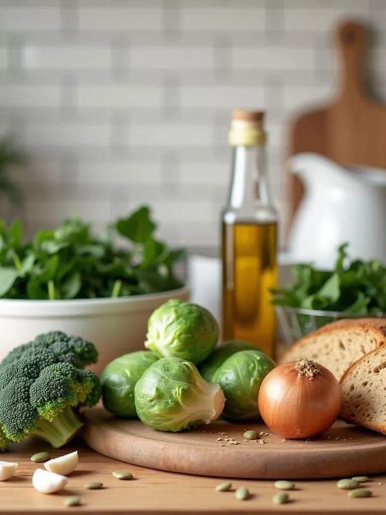 Czas przygotowania: 40 minut Składniki (na 1 porcję): – brokuł – 1/4 sztuki (150 g), – brukselka, świeża – porcja (100 g), – szpinak – 2 garści (50 g), – bulion – pół szklanki (120 g), – jogurt naturalny – łyżeczka (25 g), – chleb żytni razowy – 2 kromki (60 g), – cebula – plasterek (20 g), – czosnek – ząbek (5 g), – oliwa z oliwek – parę łyżek (10 g), – pestki dyni – parę łyżek (10 g), – sól – szczypta (0, 2 g), – pieprz – szczypta (0, 2 g).